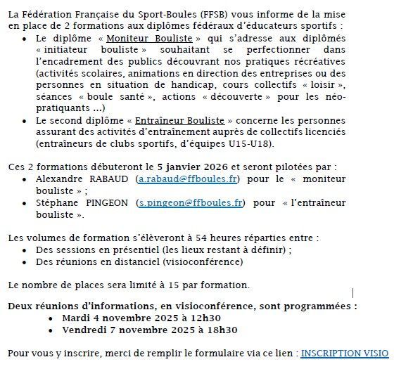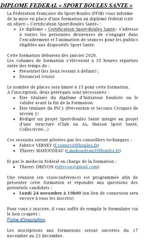 L’année sportive 2022/2023 connaitra une fin exceptionnelle. En effet, la Hte Loire Bouliste devra se mobiliser pour l’organisation du Championnat de France Quadrettes et Triples Féminins, qui se déroulera au Puy en Velay (Place du Breuil, Jardin Henry Vinay, Place Michelet) et à Brives Charensac (journée du vendredi), les 21 ; 22 et 23 juillet 2023.